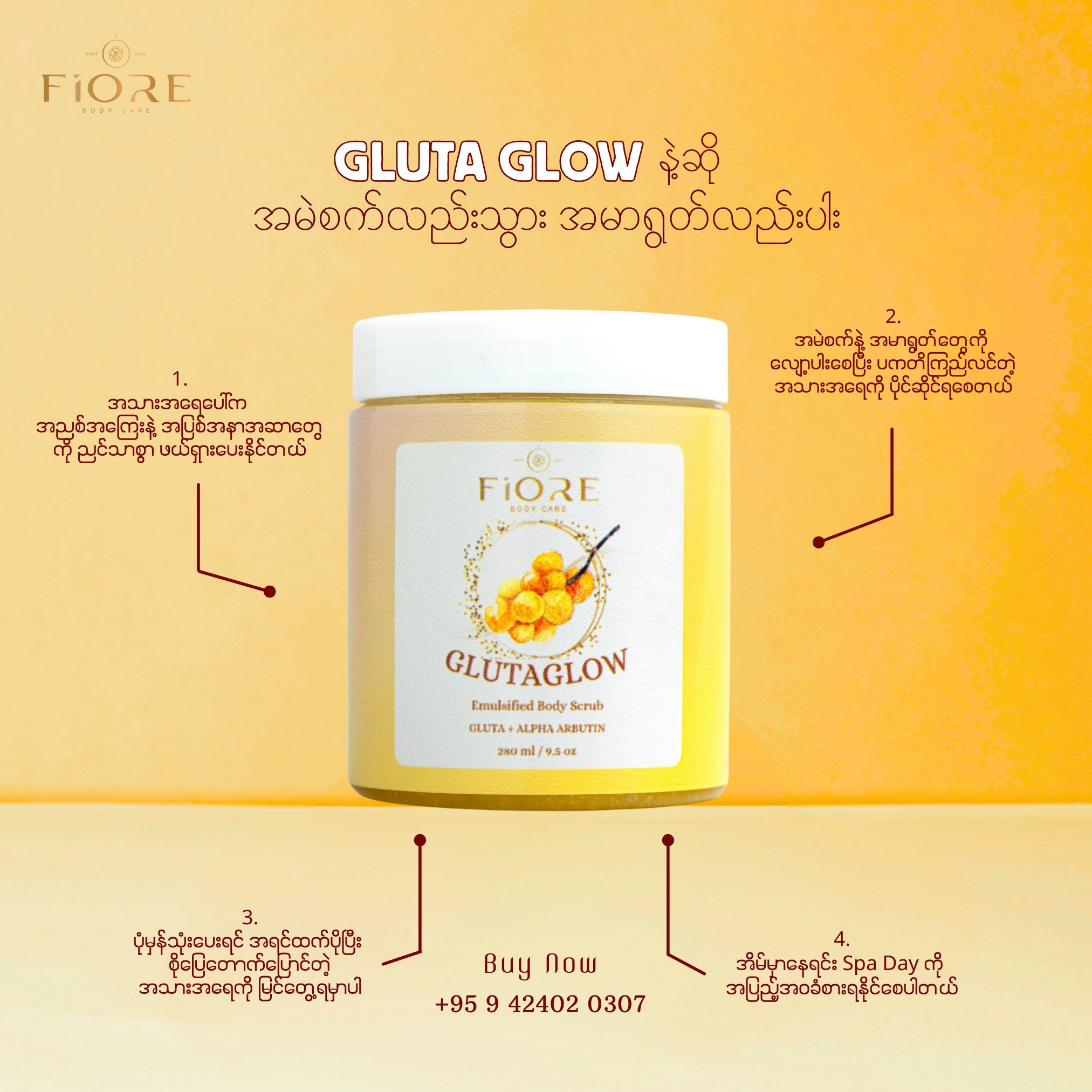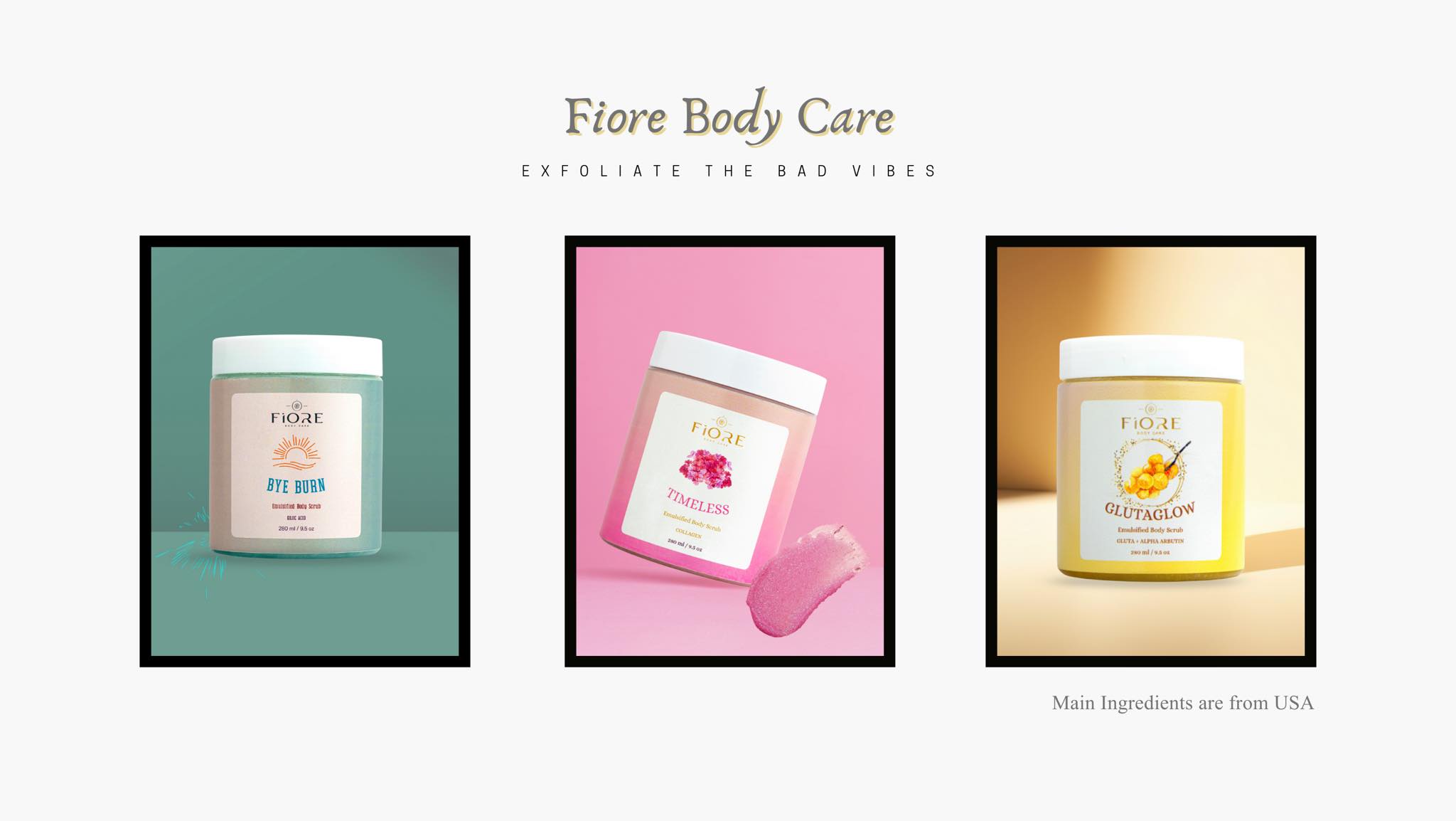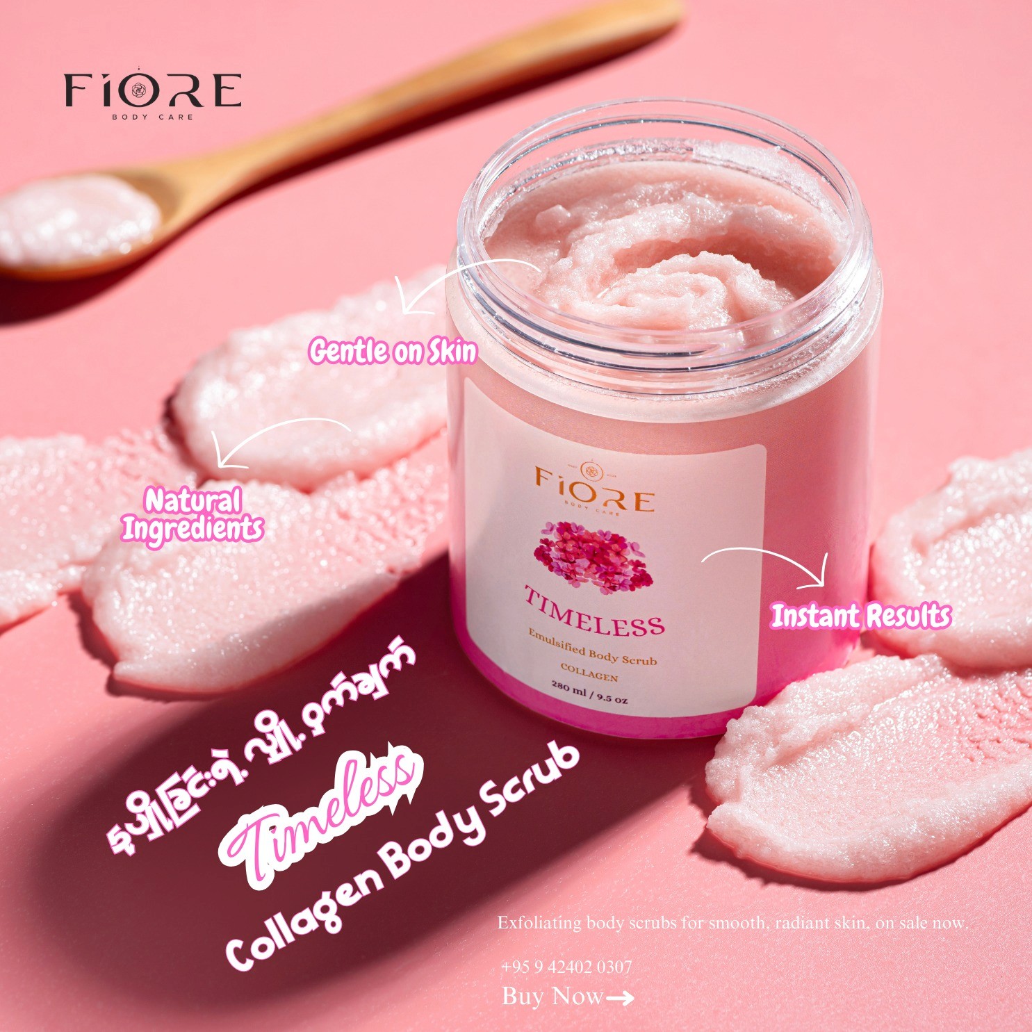 I designed factory-ready labels and packaging for Fiore Body Care, a local skincare brand in Myanmar, creating a cohesive visual system across three body scrub variants. The work balanced production requirements with strong shelf and social presence.